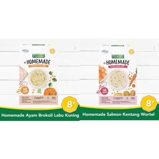 Promina homemade tersedia dalam 2 varian yaitu salmon kentang wortel dan ayam brokoli labu kuning bubur bayi promina. Promina adalah merek bubur bayi promina bubur tim daging dan brokoli terbuat dari beras, susu skim bubuk, minyak ikan, vitamin.